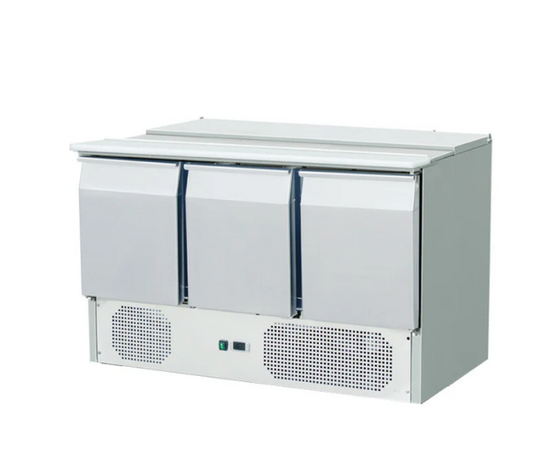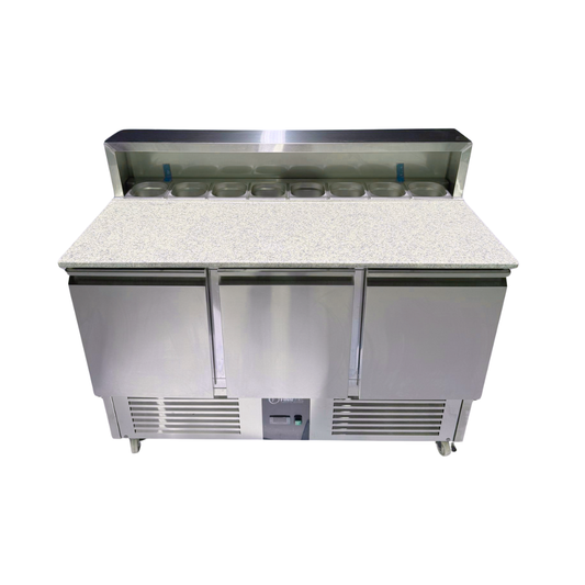 Holds 6 x GN 1/4 on topGranite work topChilled toppings unitFan cooled interior – 3 doorsDixell digital displayLow running cost MODEL: ESL3852GR-PZDIMENSIONS: W1365x D700 x H1415TEMP RANGE: +2°C to +5°CENERGY RATING: A (BASE)SHIP WEIGHT: 270 Kg