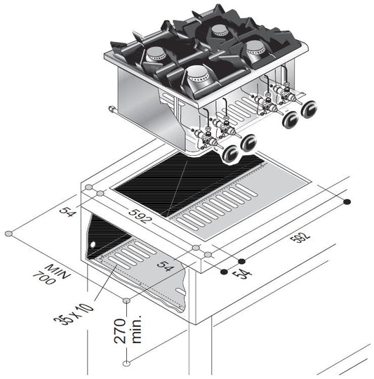 SpecificationsProduct Dimension: W:600 X D:600 X H:270 mmSKU: 7266.0020EAN code: 6017432442425Gross weight (kg): 22Version: GasBurner Capacity / Division (kW): 4x 3Number of burners: 4