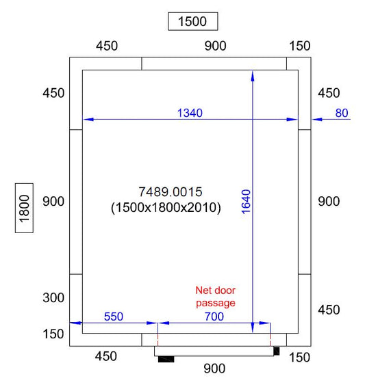 SpecificationsProduct Dimension: W:1500 X D:1800 X H:2010 mmSKU: 7489.0015Dim. interior WxDxH (mm): 1340x1640x1850EAN code: 6017448632605Gross weight (kg): 270Capacity (m3): 4Doors clear opening WxH (mm): 700x1845Lockable: YesDoor left/right hingi...