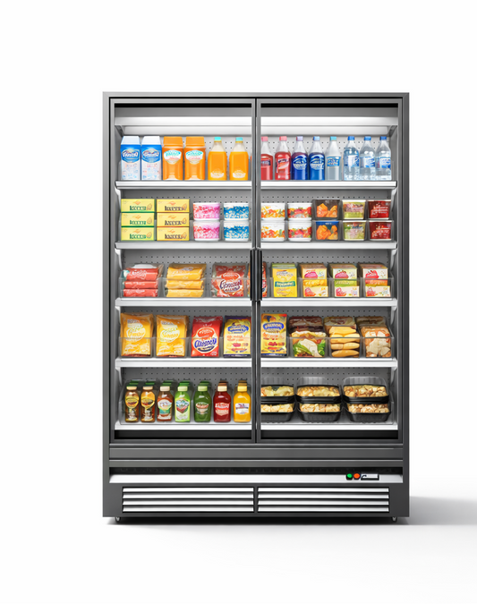 UNIFROST HVR21B 2 DOOR HINGED DISPLAY REFRIGERATOR 5 SHELVES PER DOOR 1000*720*2000 GRAPHITE BLUEFully ventilated Temp +2°C to +10°C 10 shelves included Castors included MODEL: HVR21B DIMENSIONS: W1000 X D720 X H2030 CAPACITY 800 Litres TEMP RANG...
