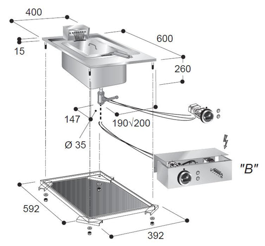 SpecificationsProduct Dimension: W:600 X D:600 X H:356 mmSKU: 7266.0080Accessories included: 2x mand en deksel en aftapkraanGross weight (kg): 40Voltage (Volt): 400Frequency (Hz): 50Electrical power (kW): 14Version: ElectricCapacity in units per h...