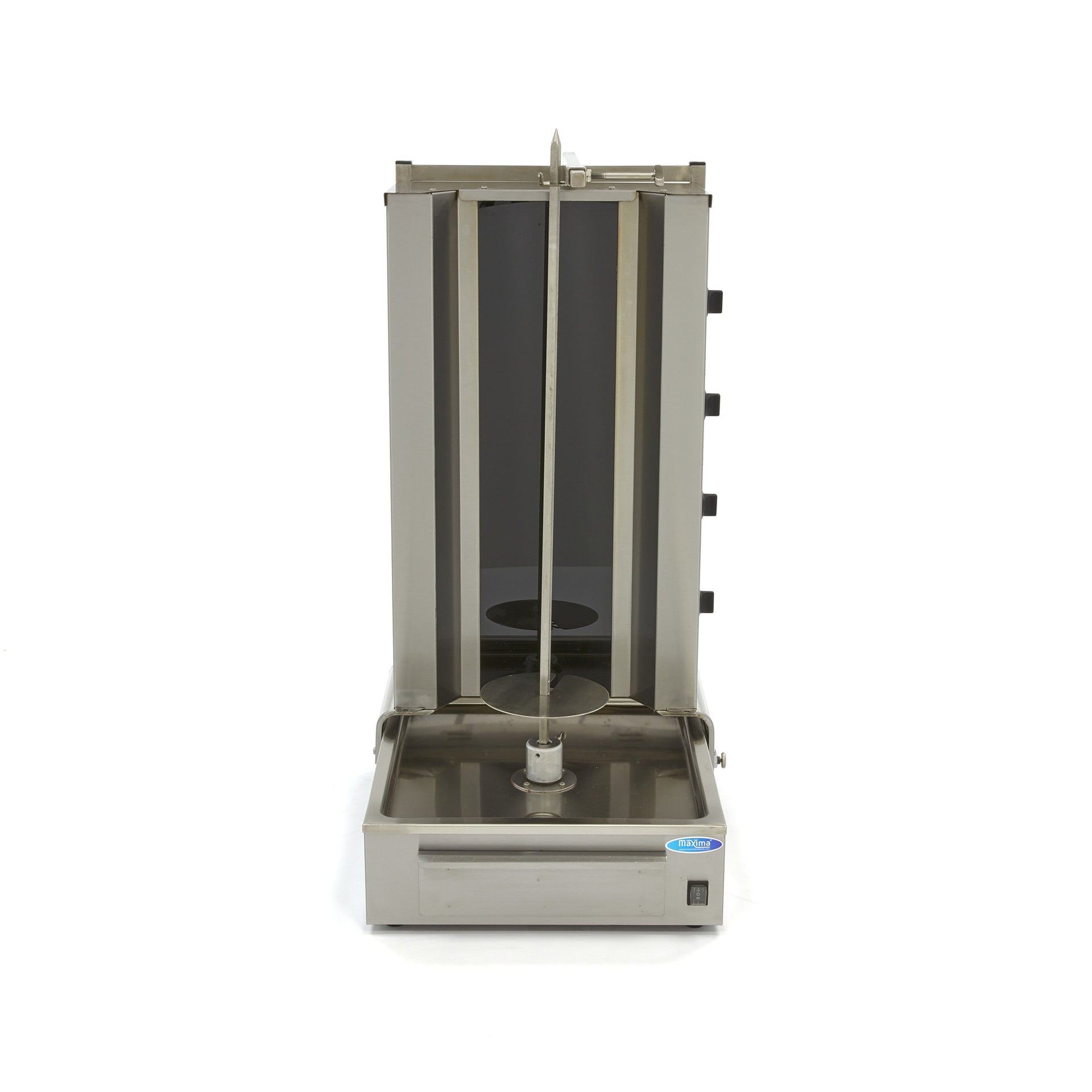 This professional kebab grill has four electric burners and is ideal for making delicious doner, kebab or shawarma. It comes standard with a stainless steel drip tray that collects the fat. It is ideal for use in any catering kitchen.