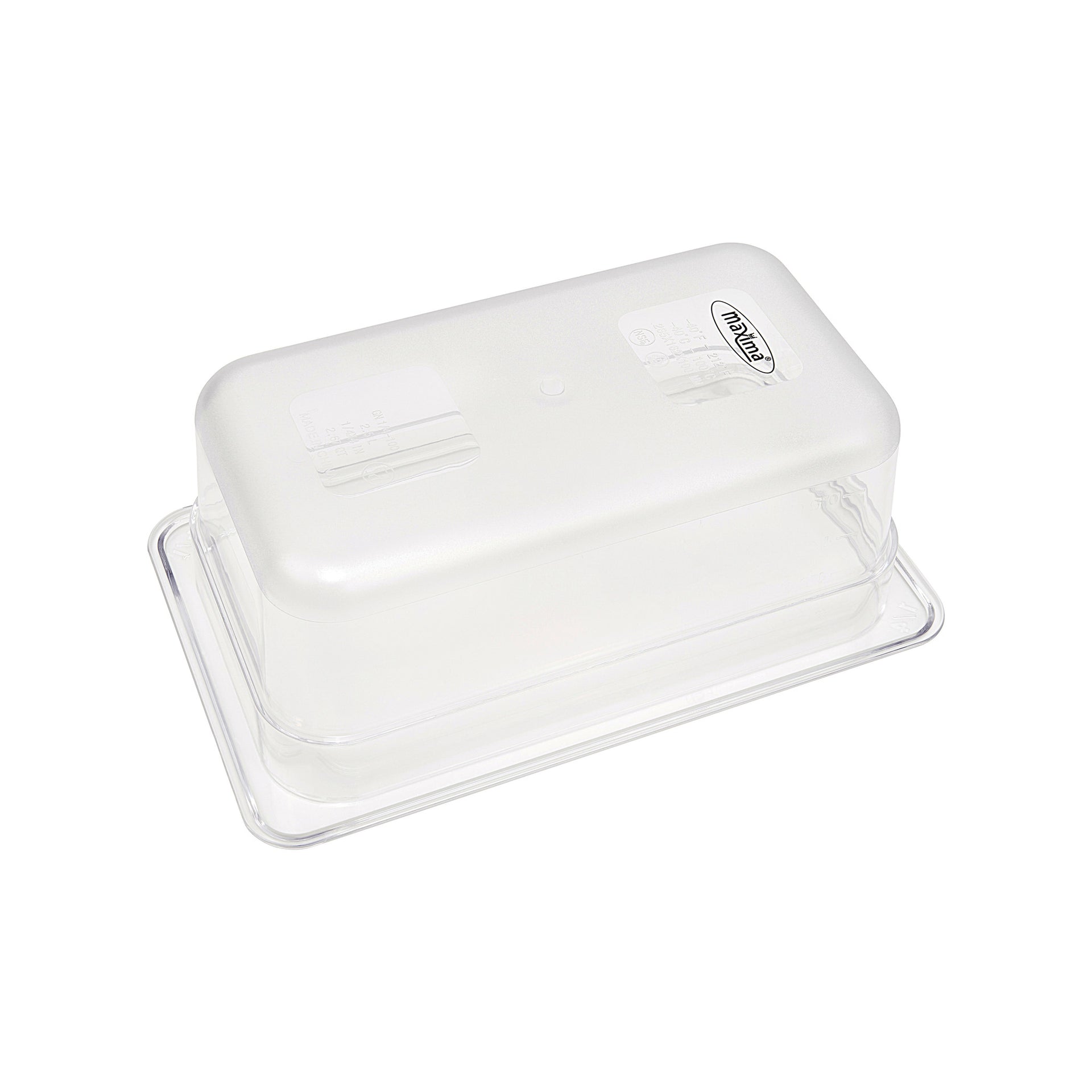 This 1/4 transparent polycarbonate Gastronorm container is 10cm deep and has a capacity of 2,8 litres. Polycarbonate GN containers are stackable, dishwasher safe and virtually unbreakable. You can use this container with many different kinds of catering equipment, such as ovens, cooling equipment, bain maries and chafing dishes.