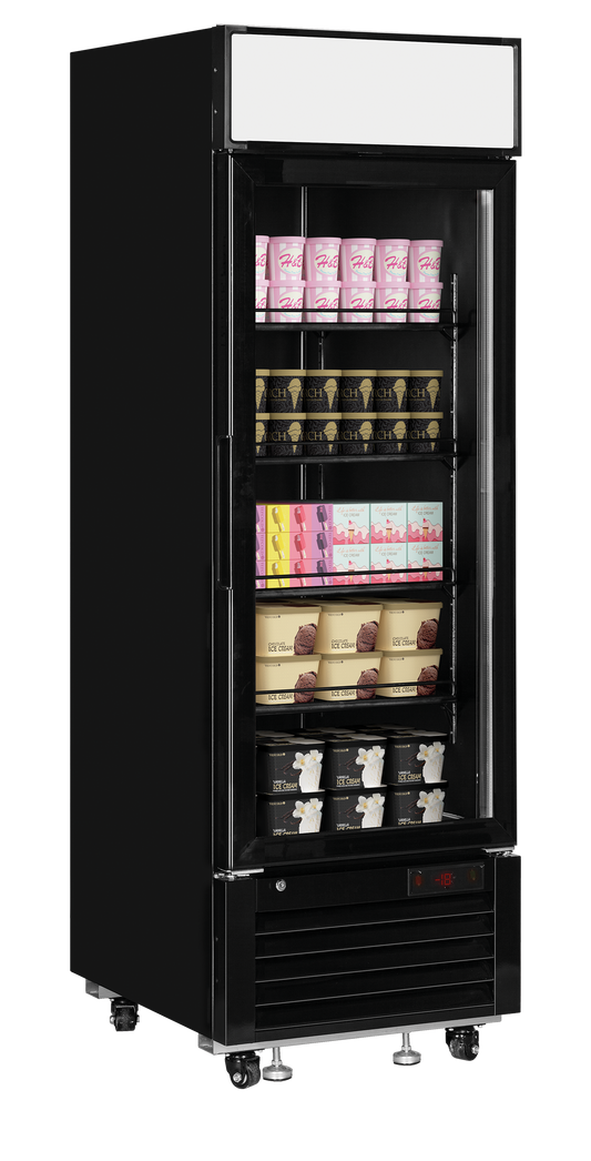 Single Glass Door Display Freezer: These upright display freezers feature a clear glass door, enhancing visibility of contents. They are ideal for showcasing frozen products in retail environments. Available in various slim and standard designs, these units cater to different space requirements.