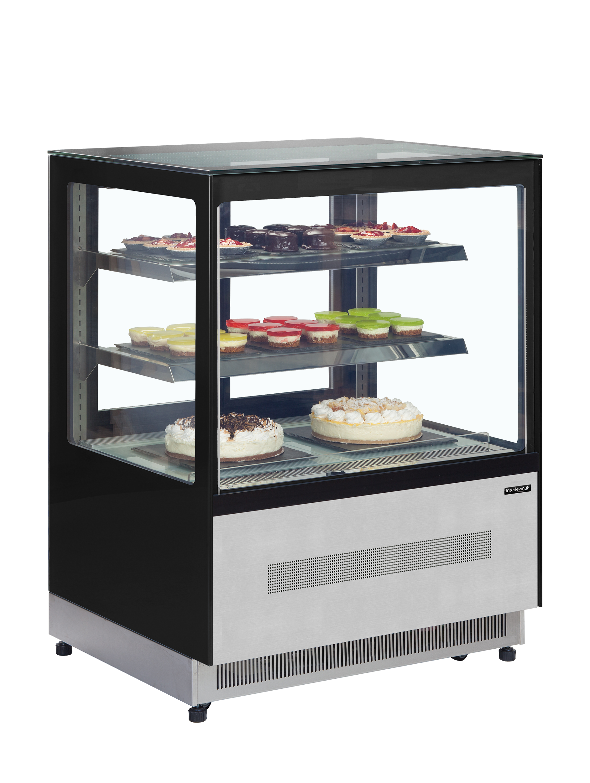 A premium range of refrigerated flat glass displays ideal for cafes and coffee shops. Suitable for deli or cake display and available in 4 different sizes, units have LED lighting under each shelf to help give an excellent display. Sliding doors to the rear allow easy loading and serving while double glazed glass helps to reduce running costs. Cabinets comes fitted with castors for easy movement with adjustable feet at each corner for positioning and levelling if required. Finished in stainless steel and gloss black glass. Fully automatic|Fan assisted cooling|Adjustable feet and castors|Adjustable shelves|LED interior light with switch|Digital controller and temperature display|Individually illuminated glass shelves|Double glazed glass|Anti mist front glass|Glass rear sliding doors