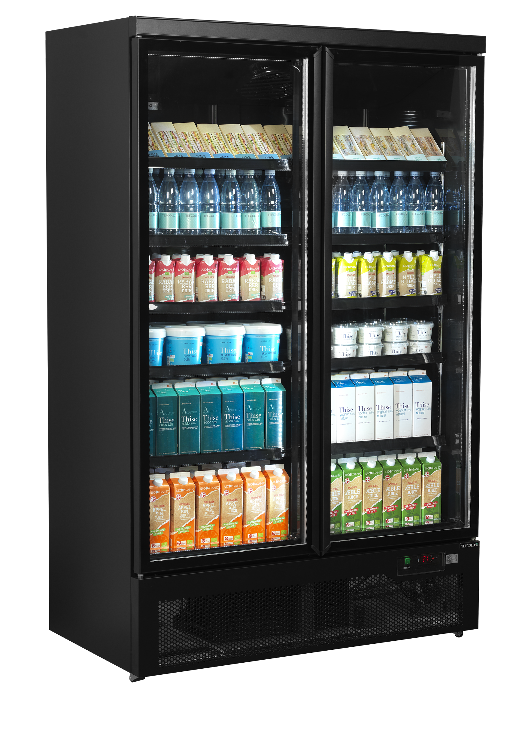 The Atom Maxi range of black glass door chillers is available in 1, 2 or 3 door options. Edge-to-edge "frameless" self-closing glass doors together with excellent storage capacity make it ideal for all types of chilled food and drink displays. The canopy-less design makes it a favourite choice for shopfitters who use it in convenience stores, delis and butchers where a chilled food and drink selection enables extra choice. A black interior with vertical LED lighting helps present the produce to customers in the best light. The Atom Maxi provides a competitively priced solution to introduce chilled produce to your customers. There is also a matching freezer option available. Great product presentation|Black interior and exterior|Low energy consumption|Self-closing glass doors|Double glazed tempered glass|Internal vertical LED light|Ventilated cooling|Adjustable shelves (split level)|Stainless steel base with mirror effect|Digital controller and temperature display|Freezer Option Available