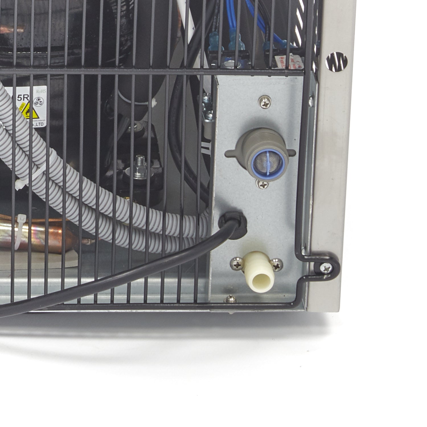 You can easily install this model beneath the bar or countertop. This works very effectively because then you always have ice cubes on hand, ready to serve. Thanks to the air-cooled system at the back, this ice machine is best suited for use indoors and in rooms that are not too warm. Furthermore, it's equipped with an overload protection. The ice maker can easily be connected to any drinking water supply using the hoses provided, so there's no need to fill the water manually, which saves you a lot of time and work. The ice machine is not equipped with a drain pump. The drain hose should be connected lower than the outlet of the machine. This ice machine also has a highly efficient cooling system and uses the refrigerant R290. Warning lights on the user-friendly control panel indicate when there is a malfunction, when the storage bin is full, or is the water level is too low.