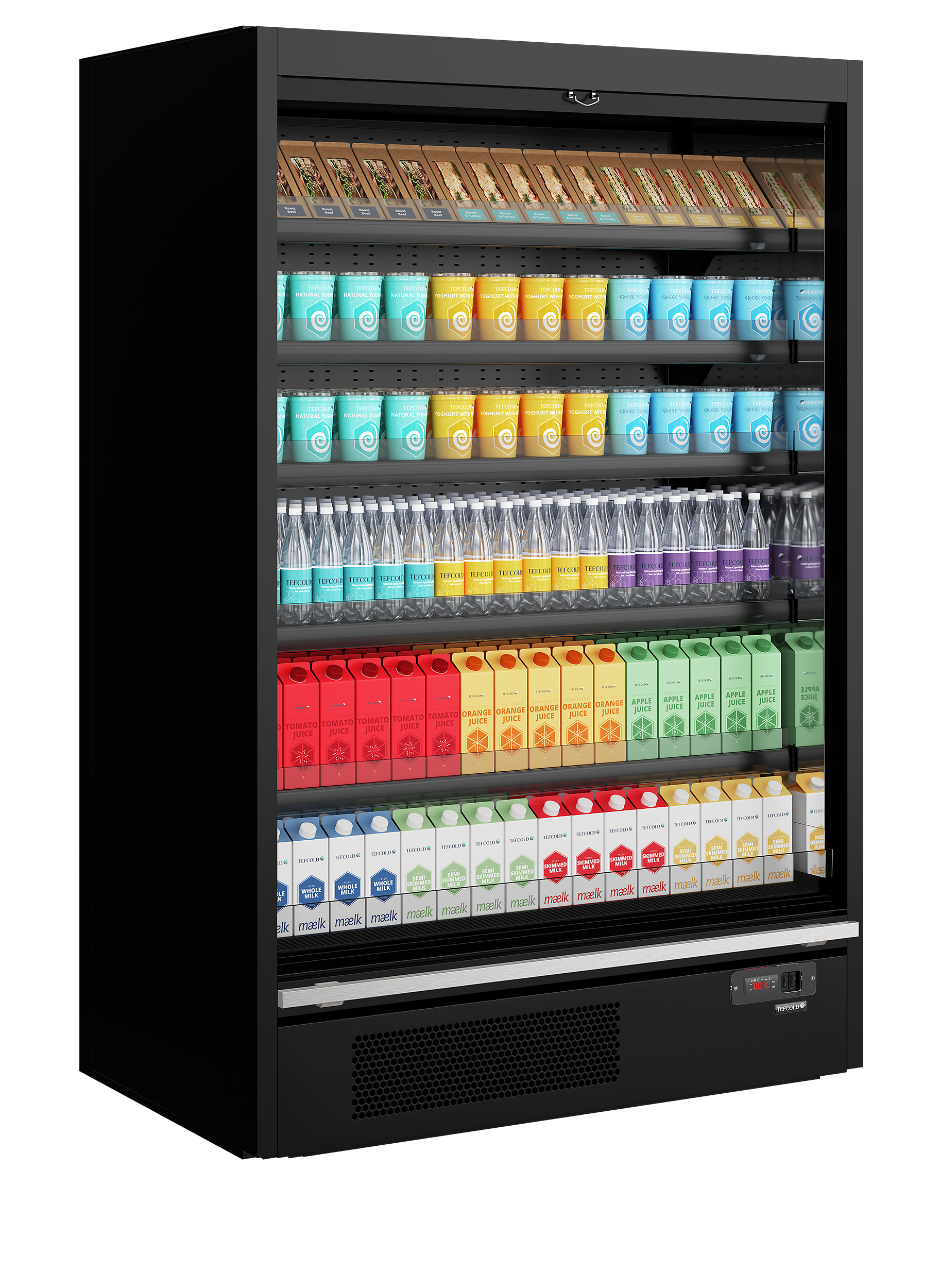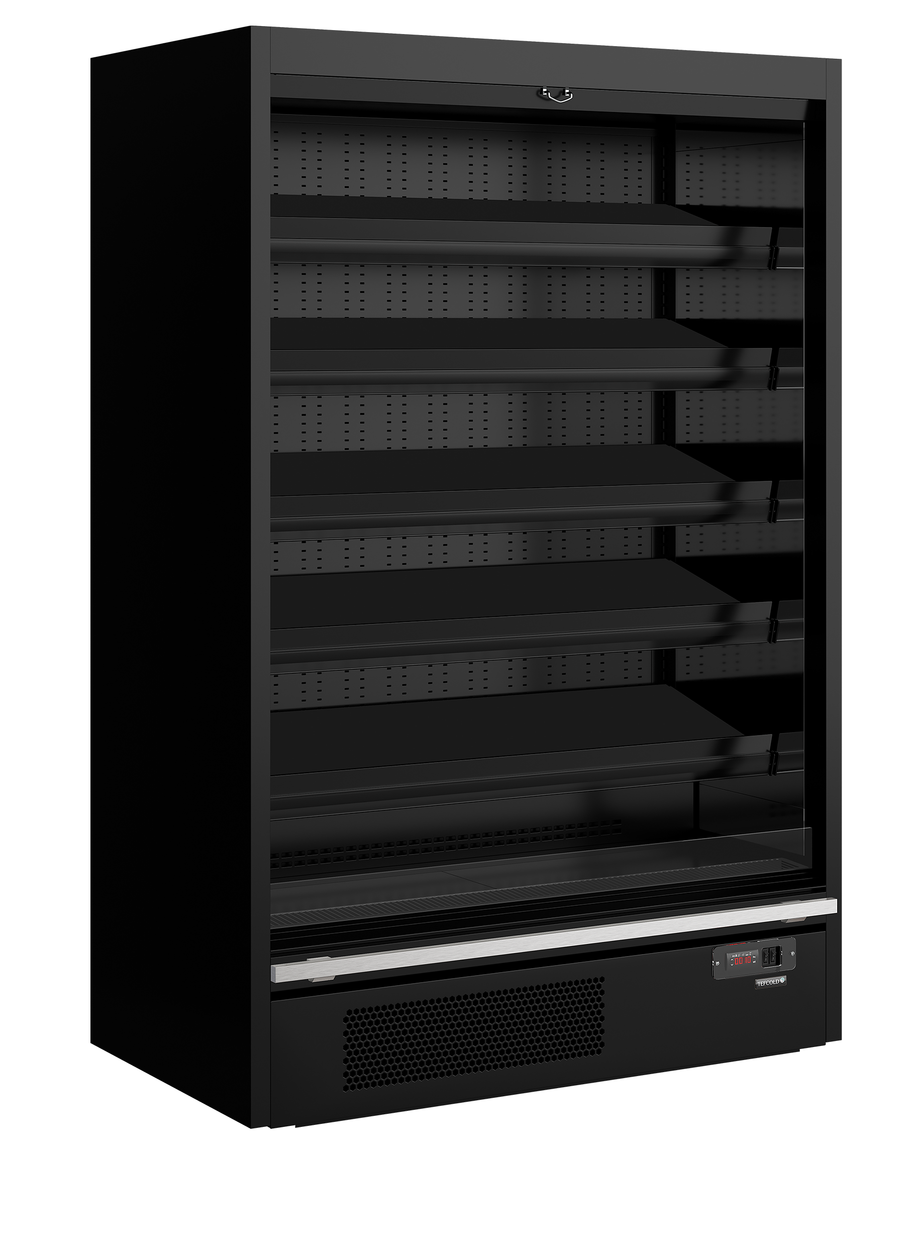 The TEFCOLD Galaxy+ open front is our latest innovation in plug-in multidecks. We've combined an expanded display area and optimised cabinet efficiency that easy access to customers for impulse buys with excellent LED lighting. The cabinets come with 39mm EPOS ticket strips together with shelf risers as standard. The 5 Shelves can be angled at 7 or 15 degrees to give more options for merchandising and creating an attractive display for your customers. The Galaxy+ open range is suitable for fresh meat, dairy and drinks. It is ideal for use in supermarkets, convenience stores, farm shops, delis and sandwich shops. Fully automatic, fan assisted cooling|Horizontal LED lighting|Solid 40 mm endwalls with mirrored interior|Soft closing nightblind|Adjustable shelves, max weight 160kg/sq metre|Shelves can be flat or angled to 7° or 14°|EPOS Ticket strips & shelf risers|Suitable for fresh meat|Can be multiplexed with kit (POA)