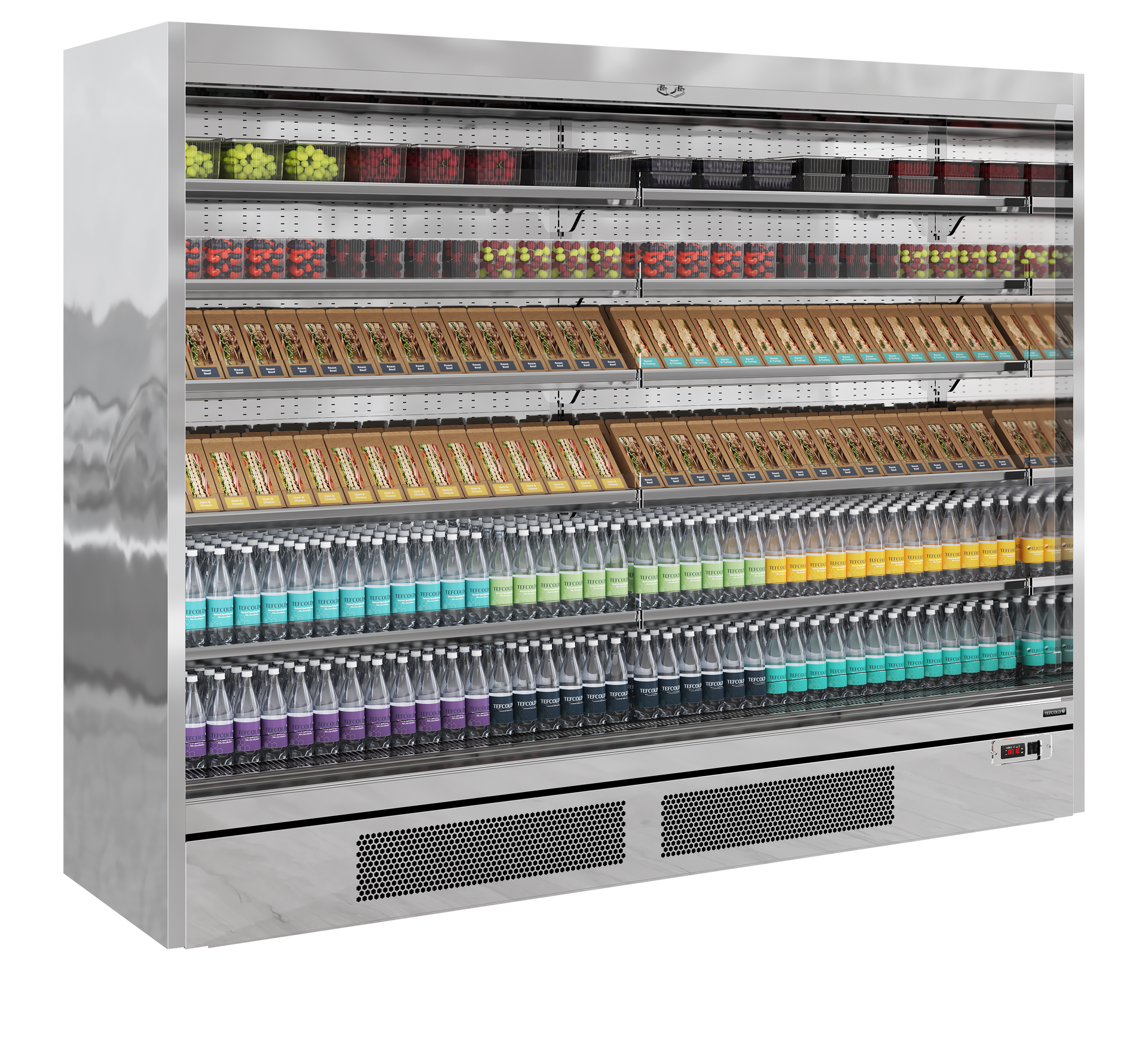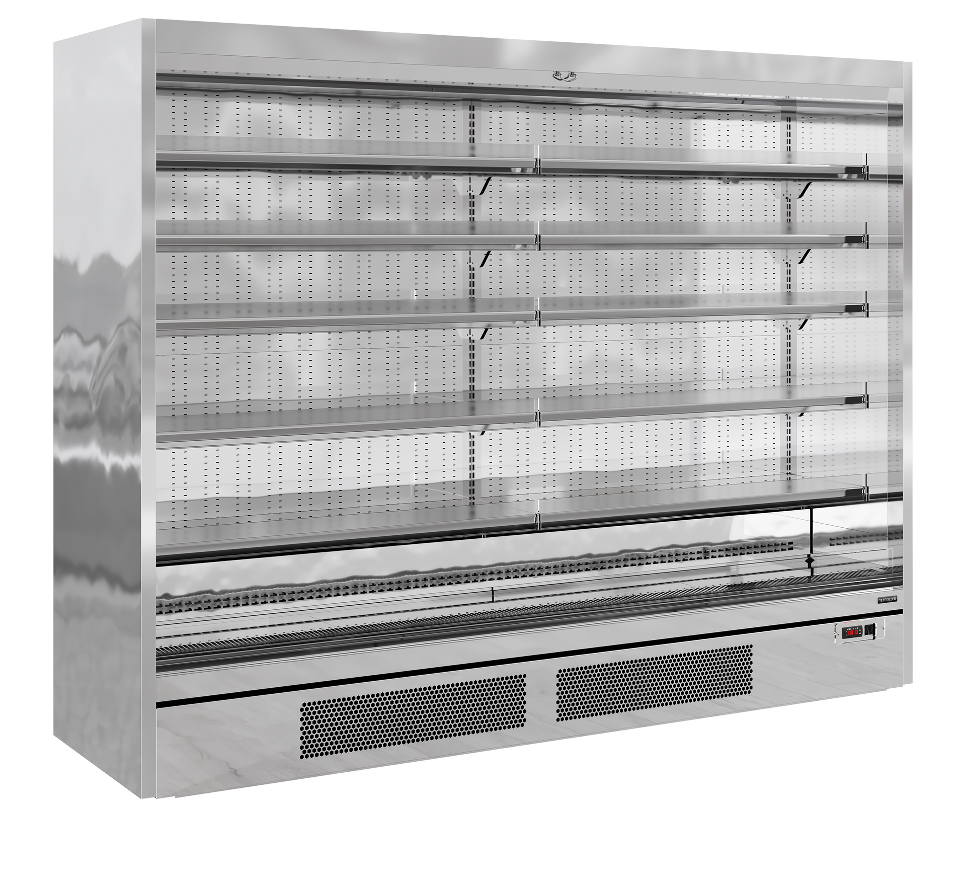 The TEFCOLD Galaxy+ range, finished in mirror stainless steel: our latest innovation in plug-in multidecks. We've combined an expanded display area and optimised cabinet efficiency. The ultra-low front and slim top canopy provide an extra 100mm of internal height, accommodating up to 5 shelves (plus base) as standard, all while maintaining an overall height of just 2040mm. With a depth of only 750mm, the unit fits through standard doors for easy installation, yet has 400mm deep shelves for maximum stock capacity. Each unit comes with heavy-duty adjustable shelves that can be tilted if needed, as well as EPOS ticket strips and shelf risers as standard. Optional extras include glass end-walls and multiplexing kits. Fully automatic, fan assisted cooling|Horizontal LED lighting|Solid 40 mm endwalls with mirrored interior|Soft closing nightblind|5 Adjustable shelves, max weight 160kg/sq metre|Shelves can be flat or angled to 7° or 14°|EPOS Ticket strips & shelf risers|Suitable for fresh meat|Can be multiplexed with kit (POA)