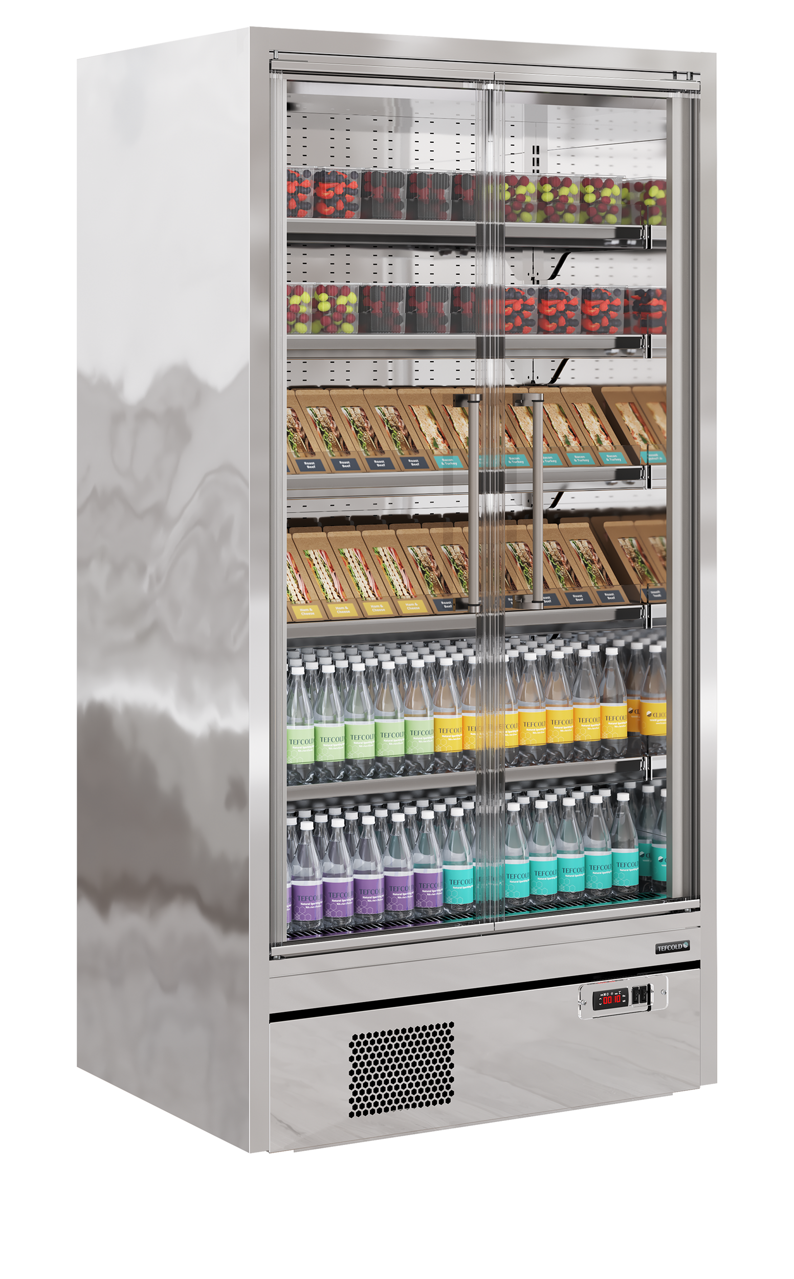 The TEFCOLD Galaxy+ FGD (Full Glass Door) range, finished in mirror stainless steel: our latest innovation in plug-in multidecks. We've combined an expanded display area and optimized cabinet efficiency with frameless, full-vision glass doors, offering enhanced product visibility that captures customers' attention. The ultra-low front and slim top canopy provide an extra 100mm of internal height, accommodating up to 5 shelves (plus base) as standard, all while maintaining an overall height of just 2005mm. With a depth of only 750mm, the unit fits through standard doors for easy installation, yet has 400mm deep shelves for maximum stock capacity. Thanks to the carefully designed refrigeration system and optimal airflow throughout the cabinets, all sizes in this range are rated either A or B for energy efficiency. Each unit comes with heavy-duty adjustable shelves that can be tilted if needed, as well as EPOS ticket strips and shelf risers as standard. Optional extras include glass end-walls and multiplexing kits. Fully automatic, fan assisted cooling|Internal vertical & horizontal LED light|Solid 40 mm endwalls with mirrored interior|Frameless hinged double glazed self closing doors|5 Adjustable shelves, max weight 160kg/sq metre|Shelves can be flat or angled to 7° or 14°|EPOS Ticket strips & shelf risers|Suitable for fresh meat|Can be multiplexed with kit (POA)|Door widths match on G14 & G26 & on G10 & G20