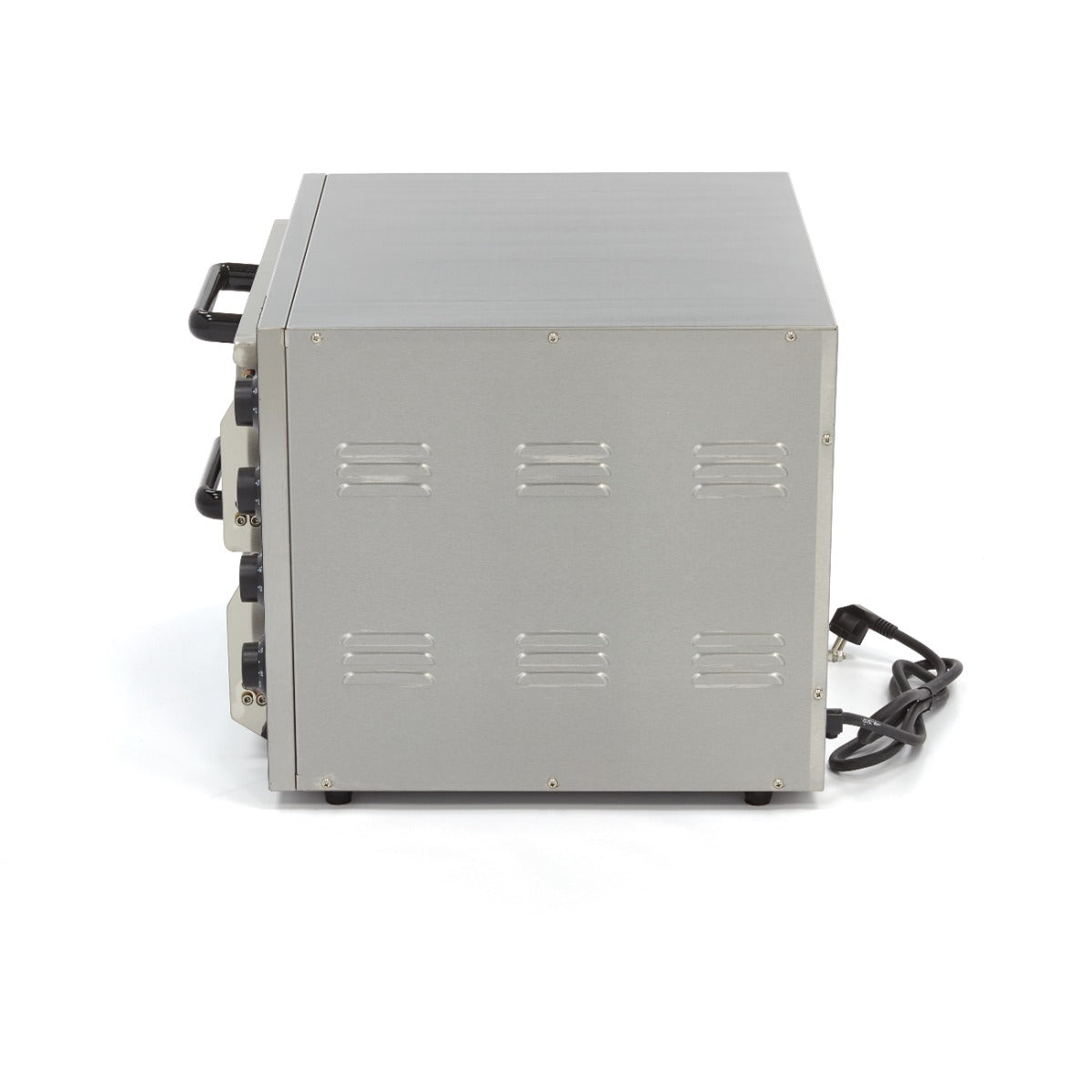Use this robust and compact pizza oven to bake several small pizzas or two large pizzas. You can place the pizza oven on a table or countertop in any catering kitchen. Besides pizza, this versatile kitchen tool is also great for baking bread and pies. The inner chamber contains 40 x 40cm stone plates and has interior lighting, useful for checking the progress of your pizza, bread or pie. As this pizza oven is quite light, you can easily move it around.