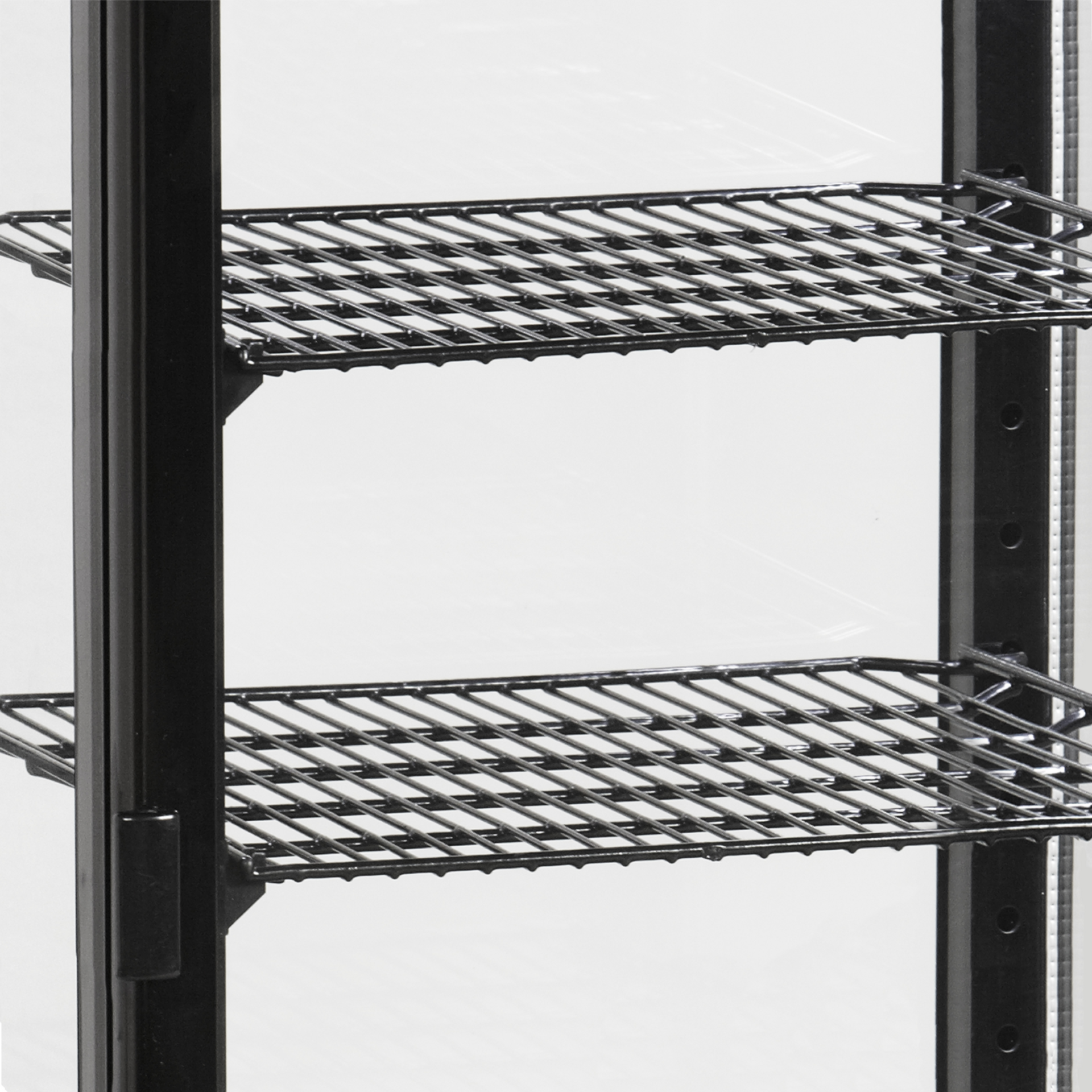 A great little counter top cooler available in 2 heights. Its sleek black finish looks great in cafes and restaurants, where this unit is excellent for display of cakes and desserts. LED lights help to display the produce while fan assisted cooling ensures even temperature over the whole cabinet. Fully automatic|Fan assisted cooling|Adjustable shelves|Adjustable feet|LED interior light with switch|Digital controller and temperature display|Replaceable door gasket|Double glazed glass|Black interior for enhanced product display